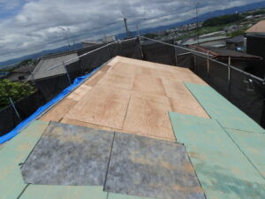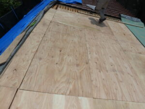 下地を張り終わったら防水のシートを張ります。これが雨水の侵入を防いでくれるのです。