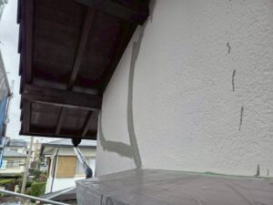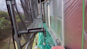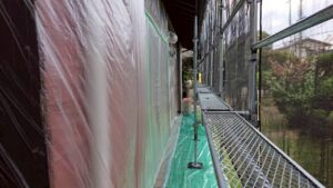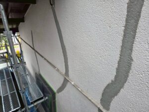 いつも通り、足場組立⇒洗浄⇒クラック左官補修⇒養生⇒補修葺き⇒